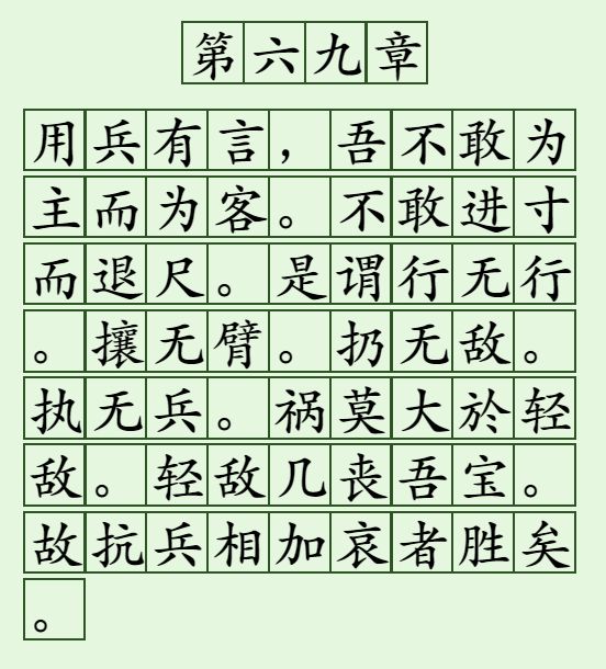 | 69 | 道德經: | 是謂行無行;攘無臂;扔無敵;執無兵。 禍莫大於輕敵,輕敵幾喪吾寶。 故抗兵相加,哀者勝矣。 ![]() |